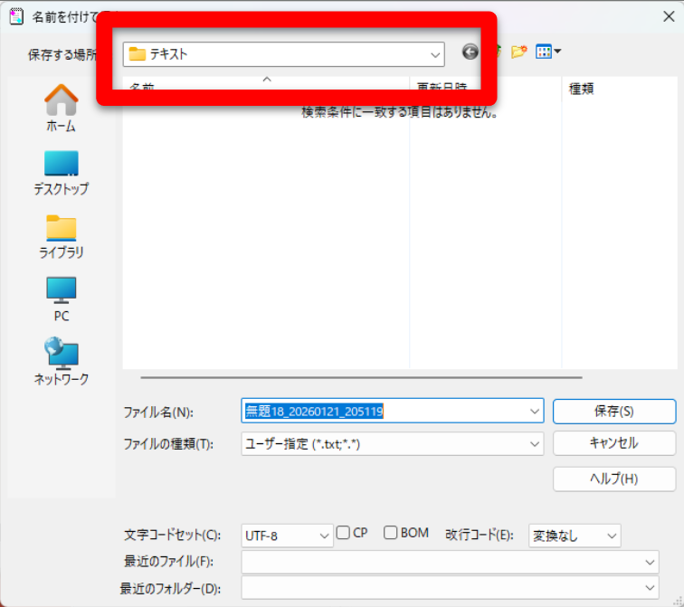 毎回テキストを新規保存しようとすると、よくわからない深い階層に飛ばされ