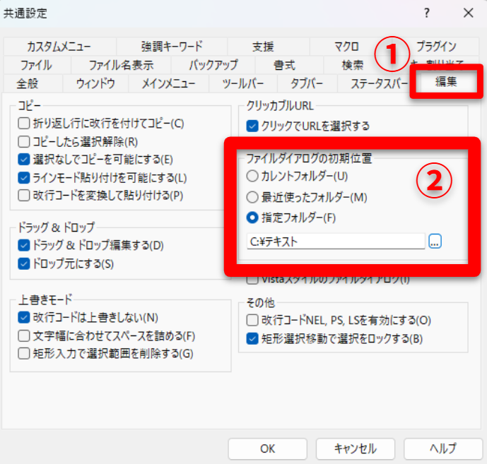 ➁編集タブ→ファイルダイアログの初期位置