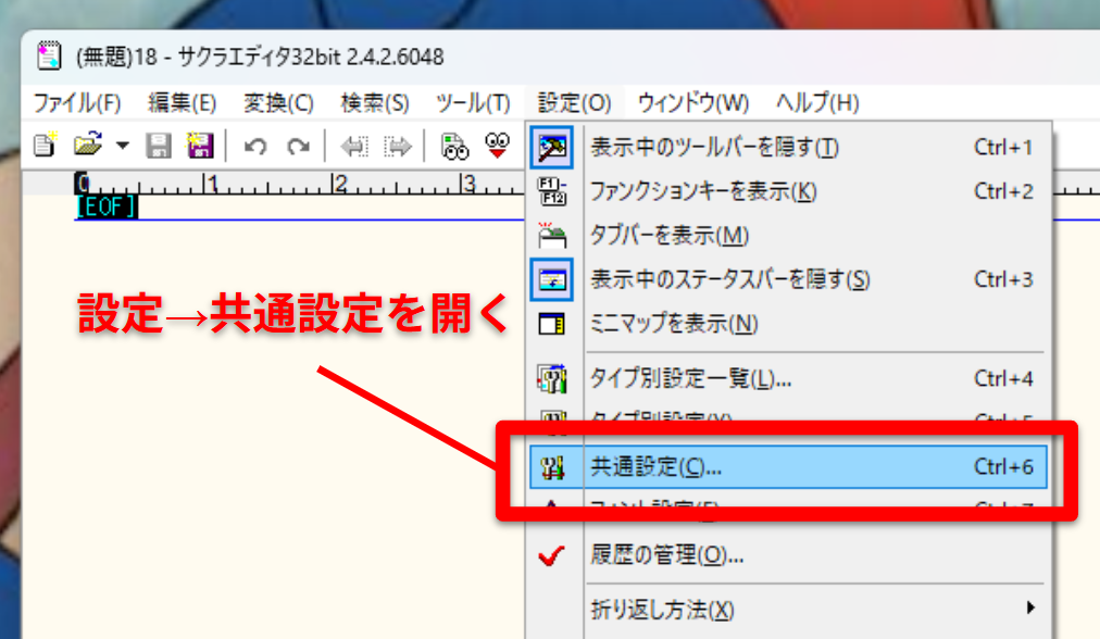 メニューから設定を開き、共通設定を開く